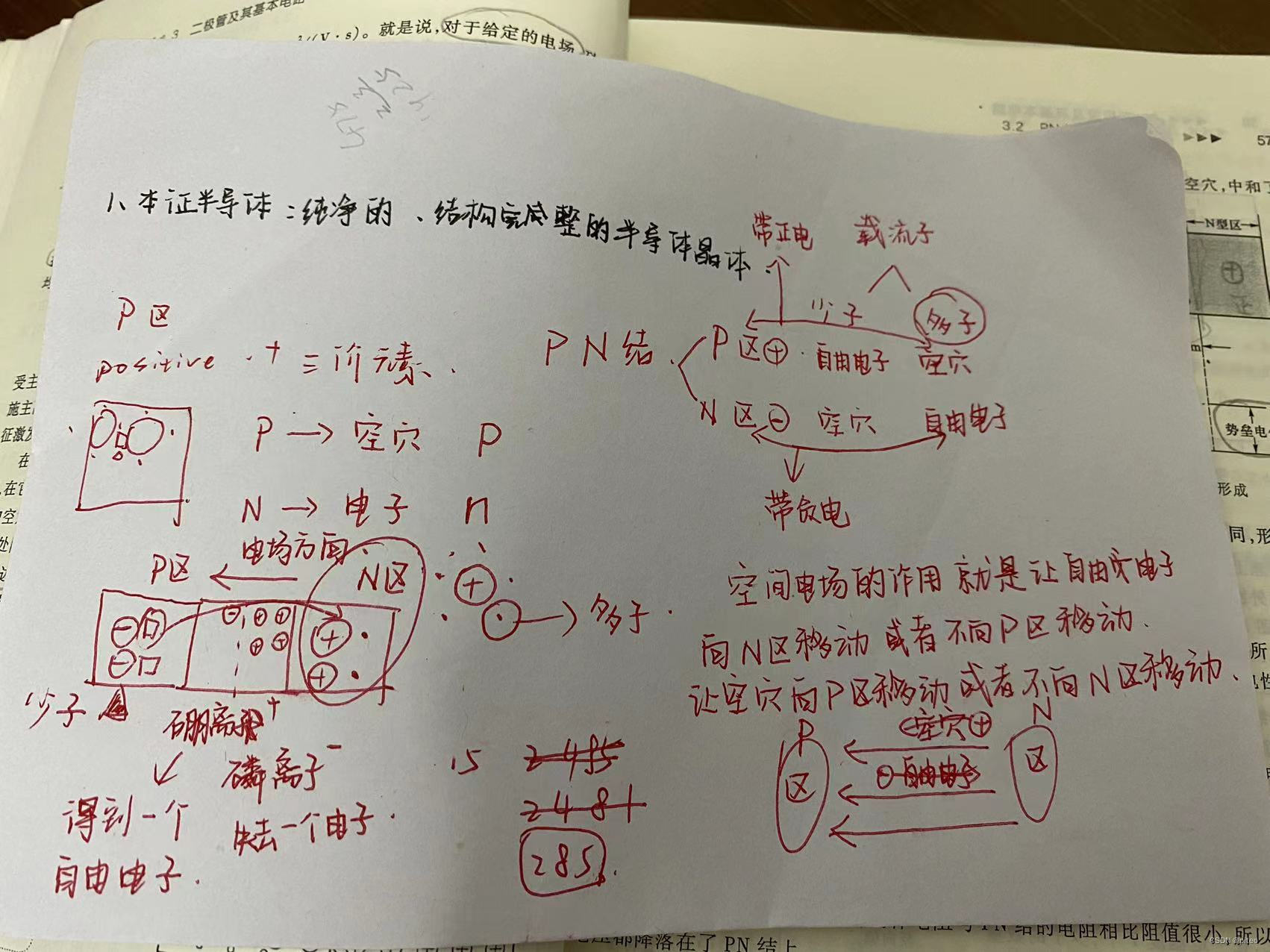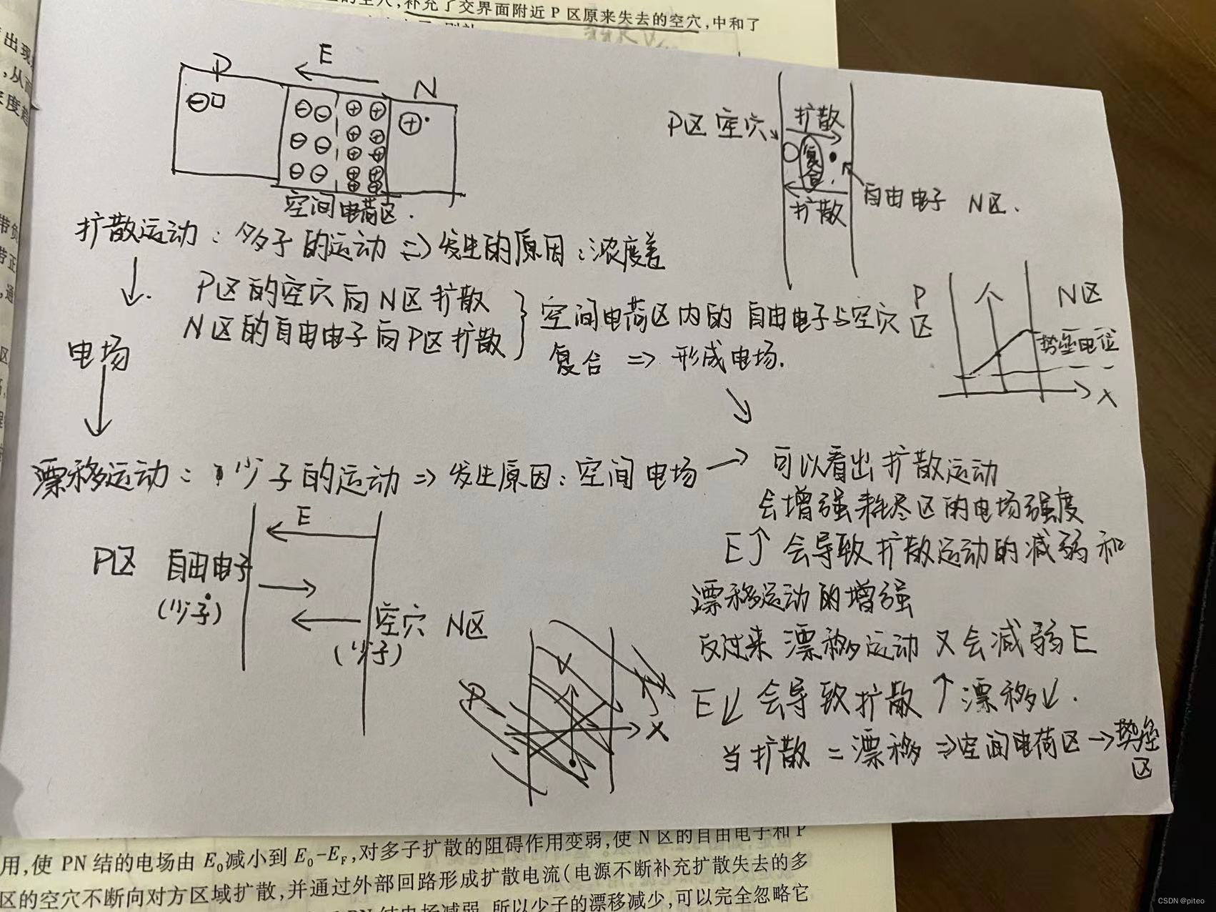 3.1.PN 结的形成:相当于把N型半导体和P型半导体“拼”在一起。在拼接的地方P区的空穴会由于扩散运动向N区移动,同理N区的自由电子会向P区移动,但是施主和受主离子不会移动,所以自由电子和空穴的湮灭只会在“拼接”处发生。载流子之间的复合会在“拼接”处形成空间电荷区(也叫耗尽区),空间电荷区的形成还会形成一个电场(内电场)。