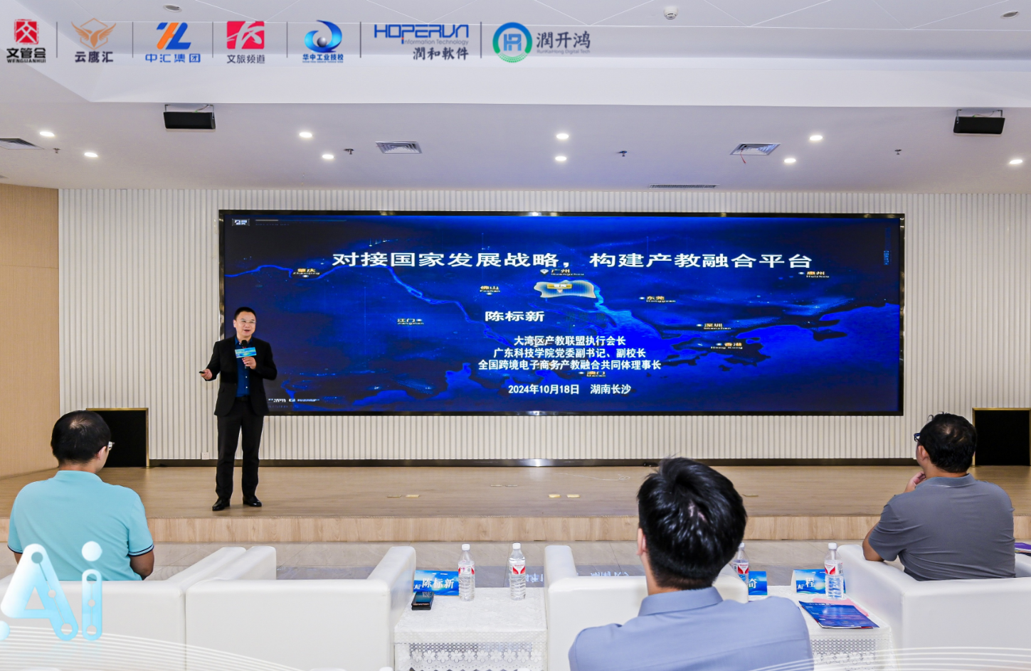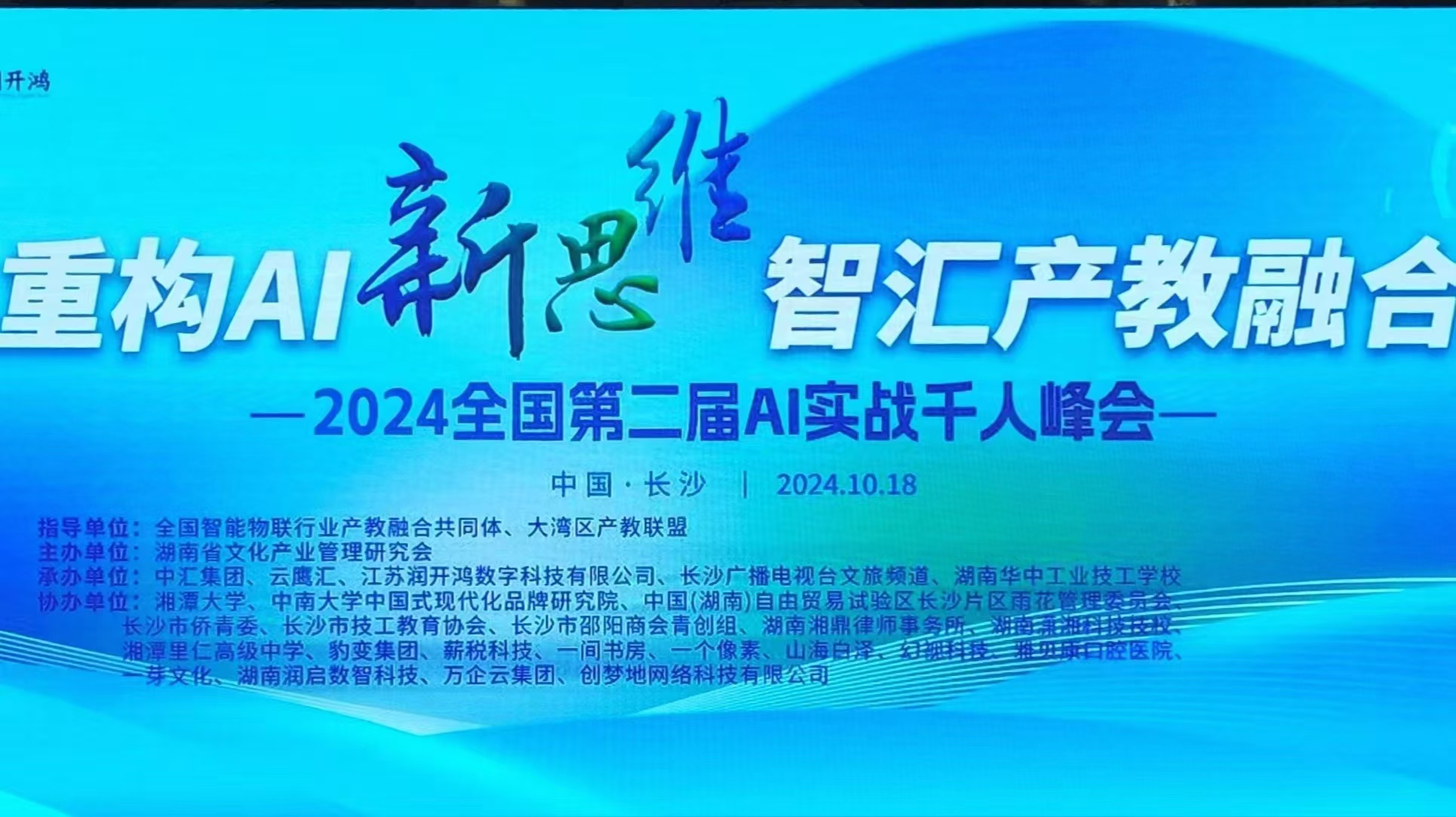 会议以“重构AI新思维 智汇产教融合”为主题,由全国智能物联行业产教融合共同体、大湾区产教联盟指导,湖南省文化产业管理研究会主办,湖南中汇教育集团、长沙广播电视台等承办,湘潭大学、中南大学等协办。与会政府领导、专家学者、企业代表围绕人工智能人才培养、AIGC应用进行了深入探讨。会议期间,陈标新与湖南省人社厅、湖南中汇教育集团、江苏润开鸿数字科技有限公司的领导进行了交流。