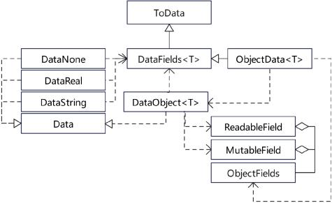 这个功能的核心是两个接口——Data和DataFields<T> ,所有类型都有一个对应的包装类型,这些包装类型都实现了Data,包括集合类型和自定义的类也都有相应的包装类型,这些包装类型仅仅对原类型包装了一层没有任何功能;而所有类型都扩展了DataFields<T>,这些扩展实现了原生类型跟Data之间的互相转换。如果待转换的Data与要转换的目标类型不符,转换逻辑可以按照参数决定是立即抛出异常还是尽量完成转换。