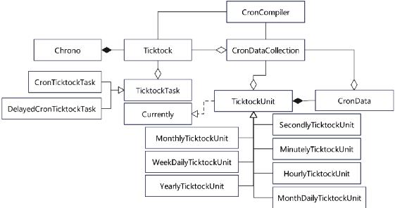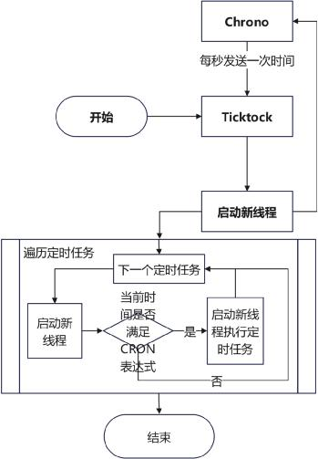 Chrono是Ticktock的成员,每秒钟启动新线程并向Ticktock发送一次DateTime,Ticktock接收到时间遍历所有定时任务并为每个定时任务启动新线程检查当前的DateTime是否满足CRON表达式,如果满足就执行这个定时任务。而且Ticktock还支持一次性的延迟任务DelayedCronTicktockTask,定时器会把这种任务的延迟时间包装成CRON表达式。