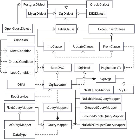类图中的RootDAO依赖的Condition结尾的类是SQL条件函数,MeetCondition执行每一个符合的条件、ChooseCondition执行第一个符合的条件,LoopCondition遍历Iterable实例。比如说可以有这样的SQL构造代码: