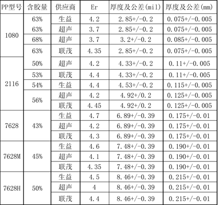 半固化片在不同的厂家常用的板材不一样,以下面这张图是生益和超声厂家常用PP片的型号为例。