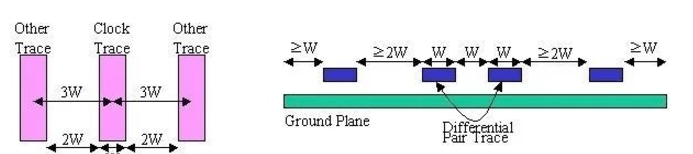 所以在时钟走线、差分线、视频、音频,复位线,以及其他系统关键电路等,多个高速信号线长距离走线的时,为了减少线与线之间的串扰,应保证线间距足够大,当线中心间距不少于3倍线宽时,则可保持大部分电场不互相干扰,这就是3W规则。如下图所示。