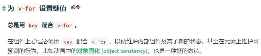 对了,v-for 里面是 "必须" 设置各个元素的 key 的 —— 正规开发中静态检查会报 Warning 的。