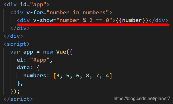 我们用 v-show 的方式来重新实现 v-if 章节的需求: 有人给了我们这些数字:3, 5, 6, 8, 7, 4,并且要我们显示其中的偶数。