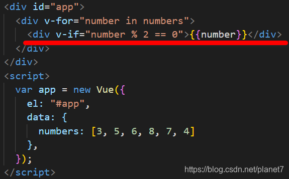 <div v-for="number in numbers" v-if="number % 2 == 0">{{number}}</div>