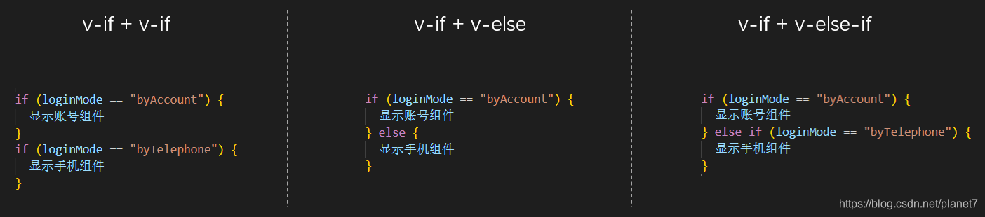 上面 3 种写法 (v-if + v-if、v-if + v-else、v-if + v-else-if) 在画面效果来看,都完全一样。