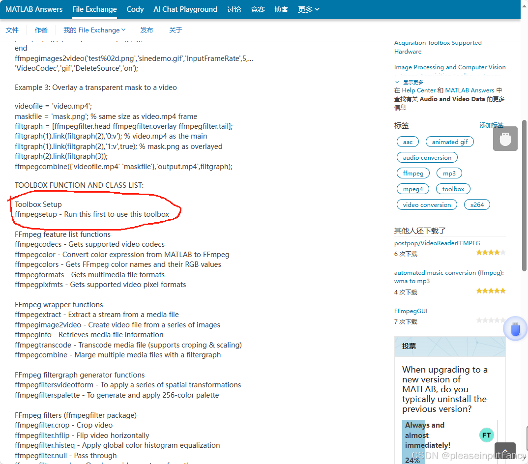 下好后要打开Matlab,先按照提示运行下面这个文件(文件名:ffmpegsetup.m)
