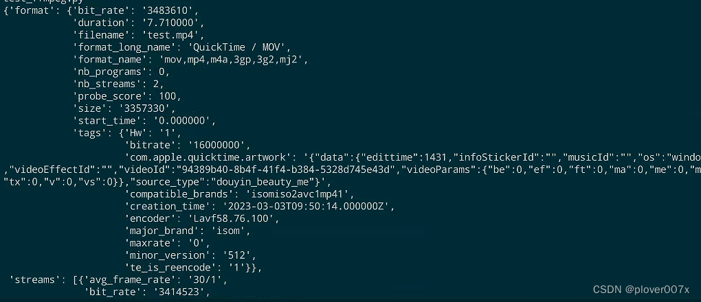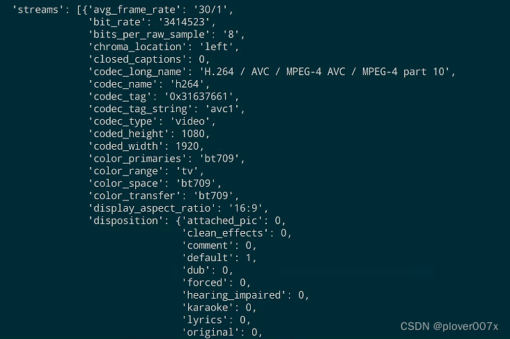 之后,就可以使用python 调用ffmpeg 获取视频的信息了(格式、编解码、采样率、分辨率等),效果如下所示: