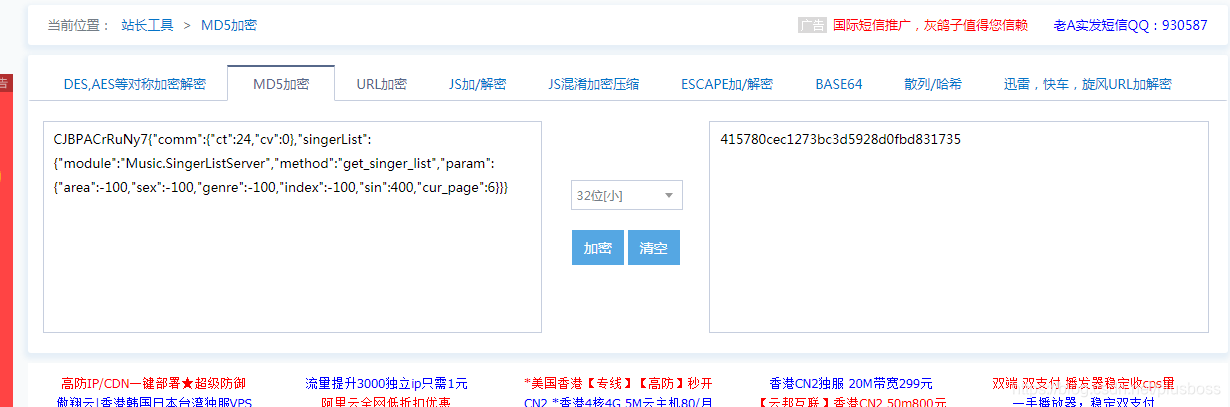 415780cec1273bc3d5928d0fbd831735 这个 就是一个 md5值,他的加密一个是 上面的 {"comm":{"ct":24,"cv":0},"singerList":{"module":"Music.SingerListServer","method":"get_singer_list","param":{"area":-100,"sex":-100,"genre":-100,"index":-100,"sin":240,"cur_page":6}}} (data ) 和 CJBPACrRuNy7 这个组合后的 md5,我们可以测试一下,是不是这样的 。打开站长工具http://tool.chinaz.com/tools/md5.aspx