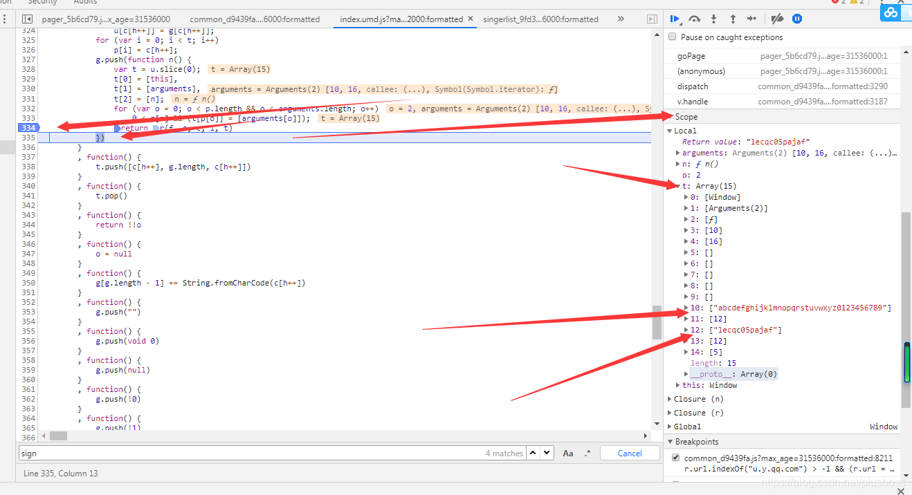 左边下了断点后,按了f10 两次,右边看到这组数据,a-z0-9的数字,下面是一个 lecqc05pajaf ,似乎是 上面的数字进行了随便提取组合到下面的,这个先放着,等会看抓包到网址是否有这些内容。再继续按f10,慢慢的,右边的scope那边关注要有没有什么内容出现,