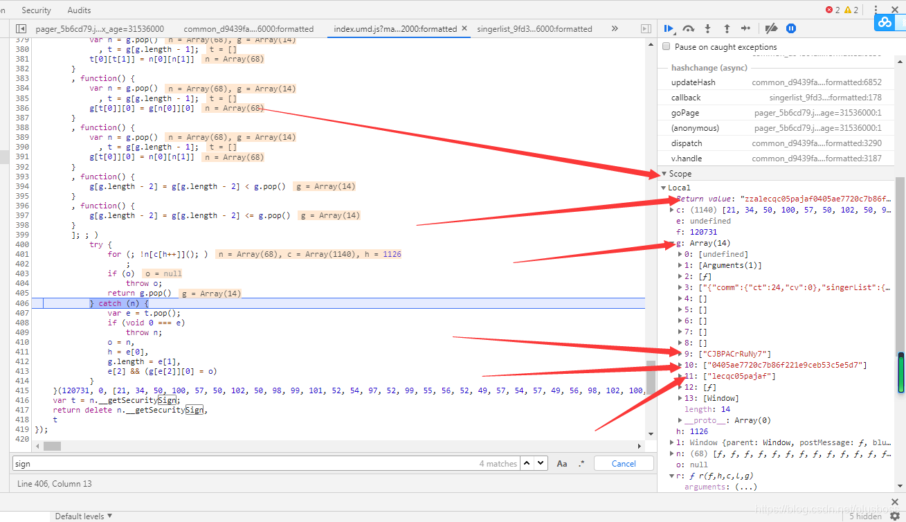 发现出现了sign 值 "zzalecqc05pajaf0405ae7720c7b86f221e9ceb53c5e5d7" 在这个scope里,我们点开看看里面的值,上面抓包获取到是随机值 lecqc05pajaf 也在里面,而 CJBPACrRuNy7 和 0405ae7720c7b86f221e9ceb53c5e5d7 又是什么那?