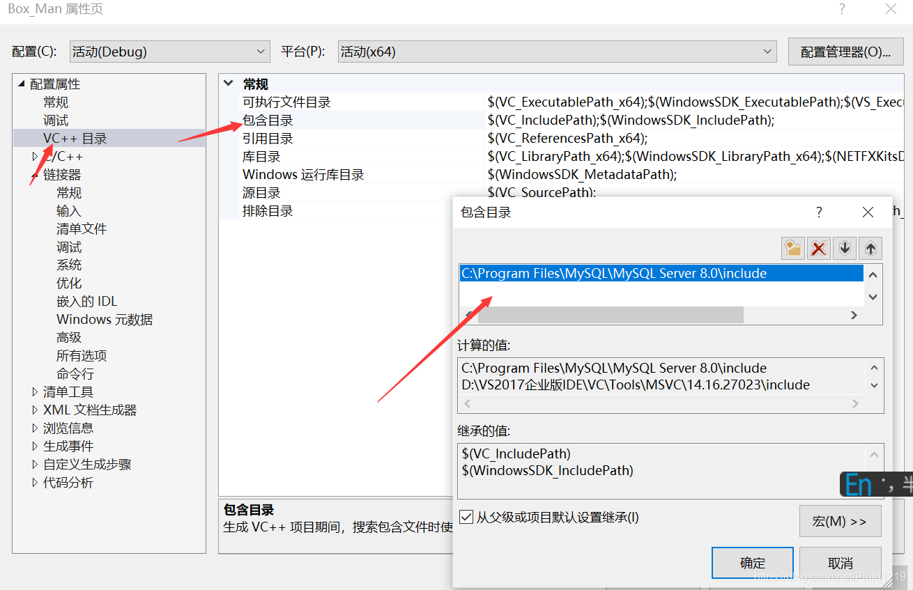 2、查看:\Program Files\MySQL\MySQL Server 8.0目录下面是否存在include和lib两个文件,打开项目属性,选择VC++目录,选择包含目录,点击 ,添加C:\Program Files\MySQL\MySQL Server 8.0\include,点击确定;