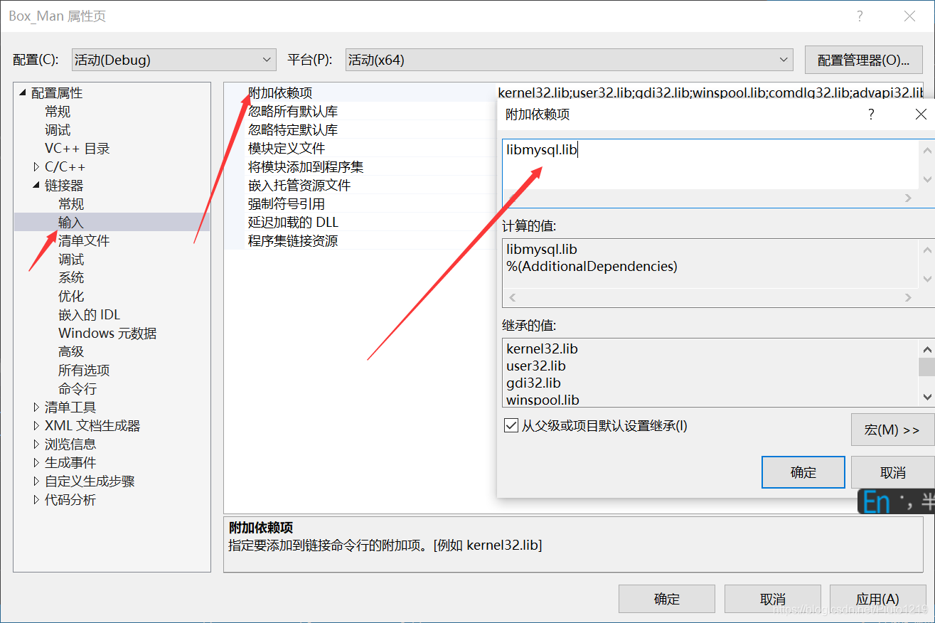 将mysql安装文件夹中lib目录下的libmysql.lib文件加到“附加依赖项”中,注意,这里直接把libmysql.lib这个依赖名加进去即可,不要加路径,点击确定,应用;