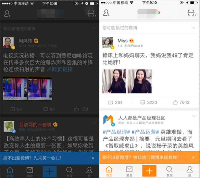 用户以下拉刷新为method,本质的desire是获取新的内容,以完成消磨时间的欲望。当没有更新的内容的时候,我们可以通过其他方法完成用户的desire,比如给他最新的热门微博或者最热的笑话段子,这样一来可以帮用户完成他的desire,二来可以帮产品的其他功能进行引流,照顾或者加重某些功能权重;三来让用户感觉产品很有人性、很懂用户。