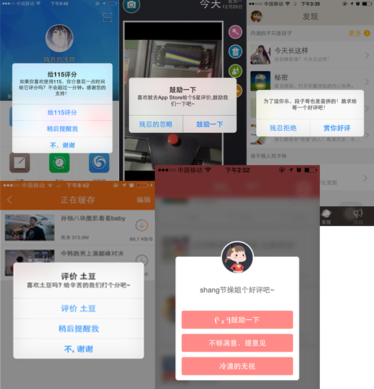 我YY的场景本质是告诉用户app帮你完成了什么或者给你带来了欢乐,是某个事件点上触发的,而不是生硬的判断你是打开app多少次,然后用卑微的声音求你去给评分,记住千万不要求,身份要平等,你要坚信你的app对用户带来的价值,评分是他们应该做的,当然前提是你app能确实帮助用户解决问题。