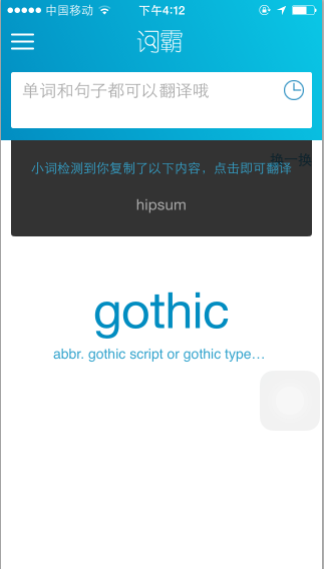 这个是我的真实场景,当时我随手下载了几个词典类的app,当打开金山词霸的时候,发现他已经检测到了我复制的单词,无需我粘贴,点击就可以查询,当时略显感动。因为它对使用词典的流程有一个很清楚的认识,一般用户都是从其他软件复制单词到词霸中,并粘贴,在很多情况比如颠簸的公交车上,每一次操作都对用户来说成本很大,那么它就直接去检测你是系统内存中有没复制过的英文内容,猜测这是你想查询的单词,在缩短了操作步骤的情况下,充满人性关怀。