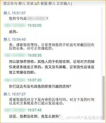 如果你看不清图的话,我简单叙述一下这个故事。大概意思是说,有一段时间我手机收不到一些验证码短信,但是别人的手机能收到,并且我把手机卡换到别人手机上,依然收不到,甚至去营业厅换了sim卡也无法解决(这证明短信网关、手机和sim卡都没问题,只能是运营商服务的问题),接连几个月都是如此。于是我找到运营商的客服,反馈了这个问题。说了半天,对方居然让我提供“下发内容的具体代码、对方下发的时间以及对方系统是否已提示发送成功”,话说,我都没收到短信,如何提供这些内容呢?