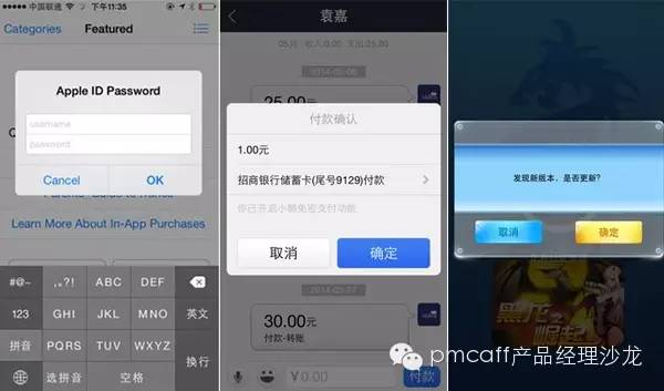 上图:在iOS平台,在不同的应用中,弹出的对话框均采用了将“主操作按钮”放右侧的设计
