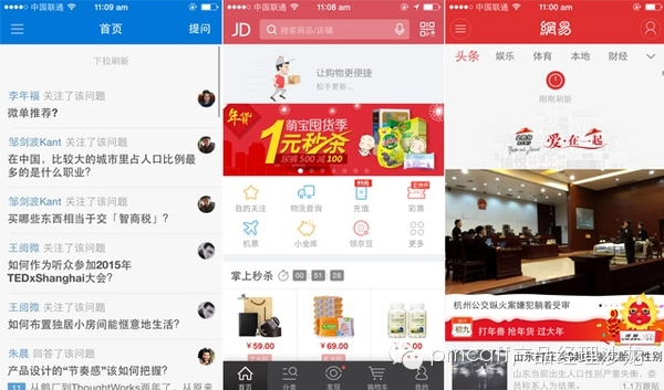 上图:从左到右,知乎使用了很简洁的“下拉刷新”4个字,京东有趣一些,你能看到一个快递员在跑,而网易新闻则是把这里开辟成了一个广告位
