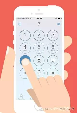上图:在iPhone的拨号界面,当按下一个号码按键尚未松开时,这个区域的背景颜色会发生改变,同时这个按键代表的数字会在屏幕上方显示,用以提示用户“你已经按到了”