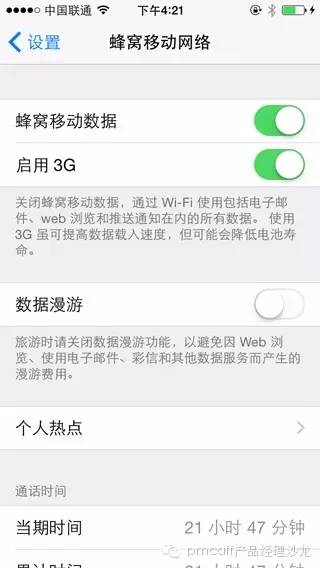 在这个界面中,有一个选项叫做“数据漫游”。对于普通用户来说,单看这个选项的字面意思,貌似无法清楚的意识到,将它打开或者关闭将会发生什么。所以在它的下方,紧接着放置了一段文字说明,用以提示用户,这个选项是用来防止在异地旅行时产生高额漫游费用的。并且,还列举了最常用的几个可能产生数据流量的行为,如“Web浏览”“电子邮件”等。这样,即便用户完全运营商的“数据业务”没概念,他也能意识到,在漫游时使用这些功能,就可能会被“大量扣费”,从而做出适合他的设置。