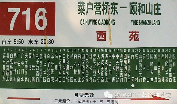 这个场景中的问题在于,公交站牌只提供了站名列表,但是并没有有效的提醒你行车的方向。有的城市有箭头指示,但是一般那个箭头都不太明显,并且在这个方案中,需要将站名列表与箭头相结合才能表意全面。比如这样: