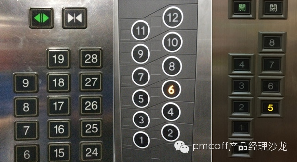 与此相反,我们看另一个例子,想象一下电梯上的各种按钮。每一部电梯上的按钮其承载的功能几乎完全相同,无疑就是选择楼层、开关门,最多再加一个呼叫功能。但是当你走进一栋陌生的写字楼,你要上7层,你肯定会在一堆按钮面前迟疑一下;终于找到7了,按下,然后发现门还没关,你继续找关门键,十有八九还会迟疑一下,然后才能正确操作。