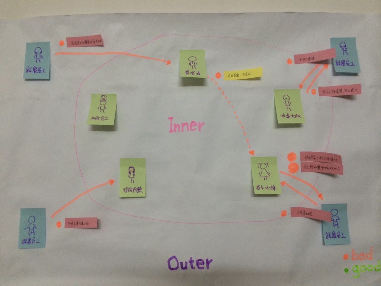 邀请这些关键人物进行访谈,询问他们对服务过程中,与之接触的其他关键人物or关键环节的印象和想法,了解他们的体验感受,从而得知他们对其他与之相关的关键人物的情绪。最终通过资料搜集得到最普遍的印象想法,并用连线地图的方式把大家串联起来,这样就能一目了然地了解问题所在,能快速找到问题的突破口。