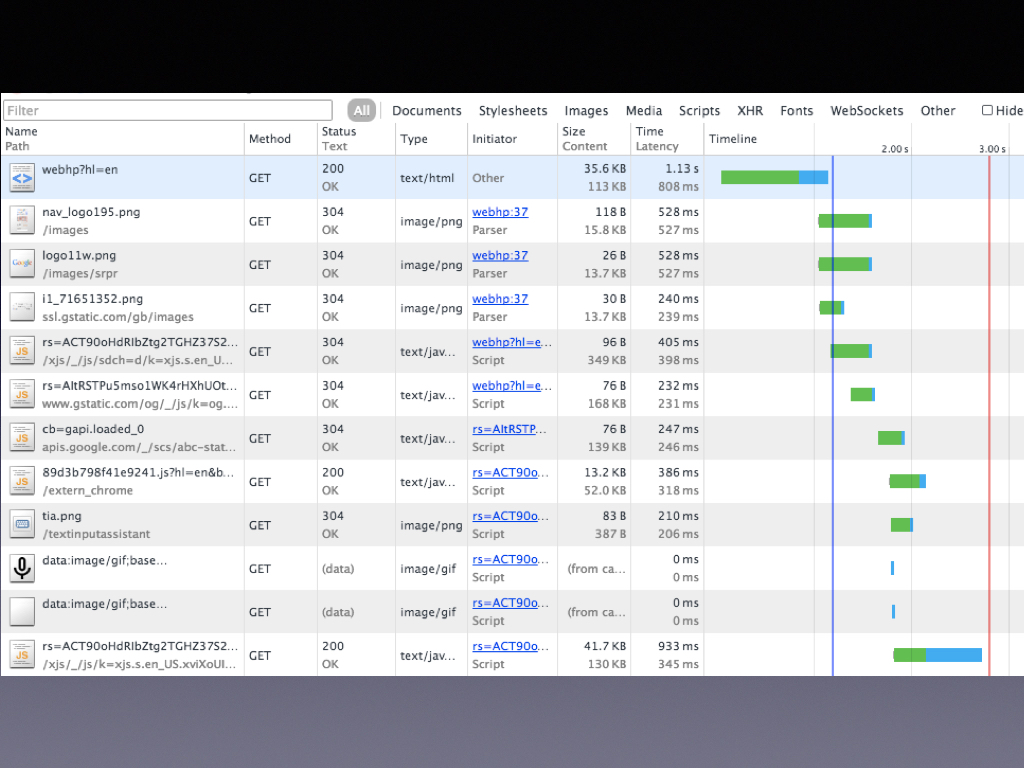 上图这个界面看起来很复杂,但对于非程序员而言,HTTP 协议运行情况只要关注其中的几个关键部分:第一列,即资源的 URL;第四列是这个资源的类型。在第一个请求和后续的请求之间有一根蓝线,即进度条。而 HTTP 协议中运行的项目越少,浏览器加载的速度越快。图中 Google 就处理得很好,只有 10 个左右的请求。