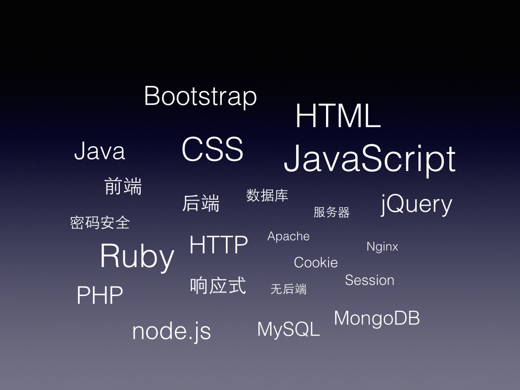 这中间涉及的技术知识,前端包括 HTML,CSS,JavaScript,jQuery 以及 Bootstrap ;后端包括 HTTP 服务器,后端编程语言,数据库以及 Cookie 和 Session;移动开发分为原生,混合式,HTML5,以及不同的移动端技术选择在功能和开发成本上的比较。