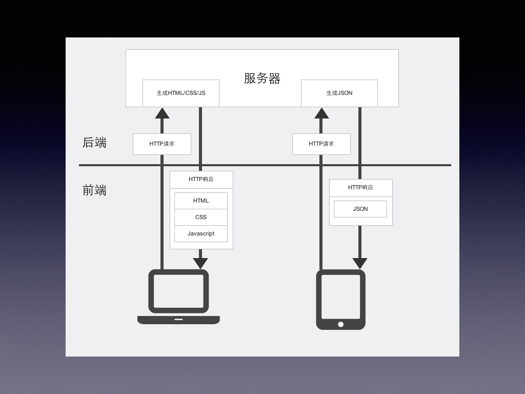 前后端的划分,可以简单地理解为凡是运行在用户设备上的技术都可以称为前端技术( 比如 HTML / CSS / JS,甚至移动设备的 Obj-C / Swift );而后端的作用就是负责将这些东西封装在 HTTP 的数据包中然后通过网络传送到前端。当然除了这些前端文件,后端还有一个更重要的职能,即保存和提供用户数据,比如移动端常见的 JSON 就是目前最流行的在后端和前端之间传输的一个文件格式。
