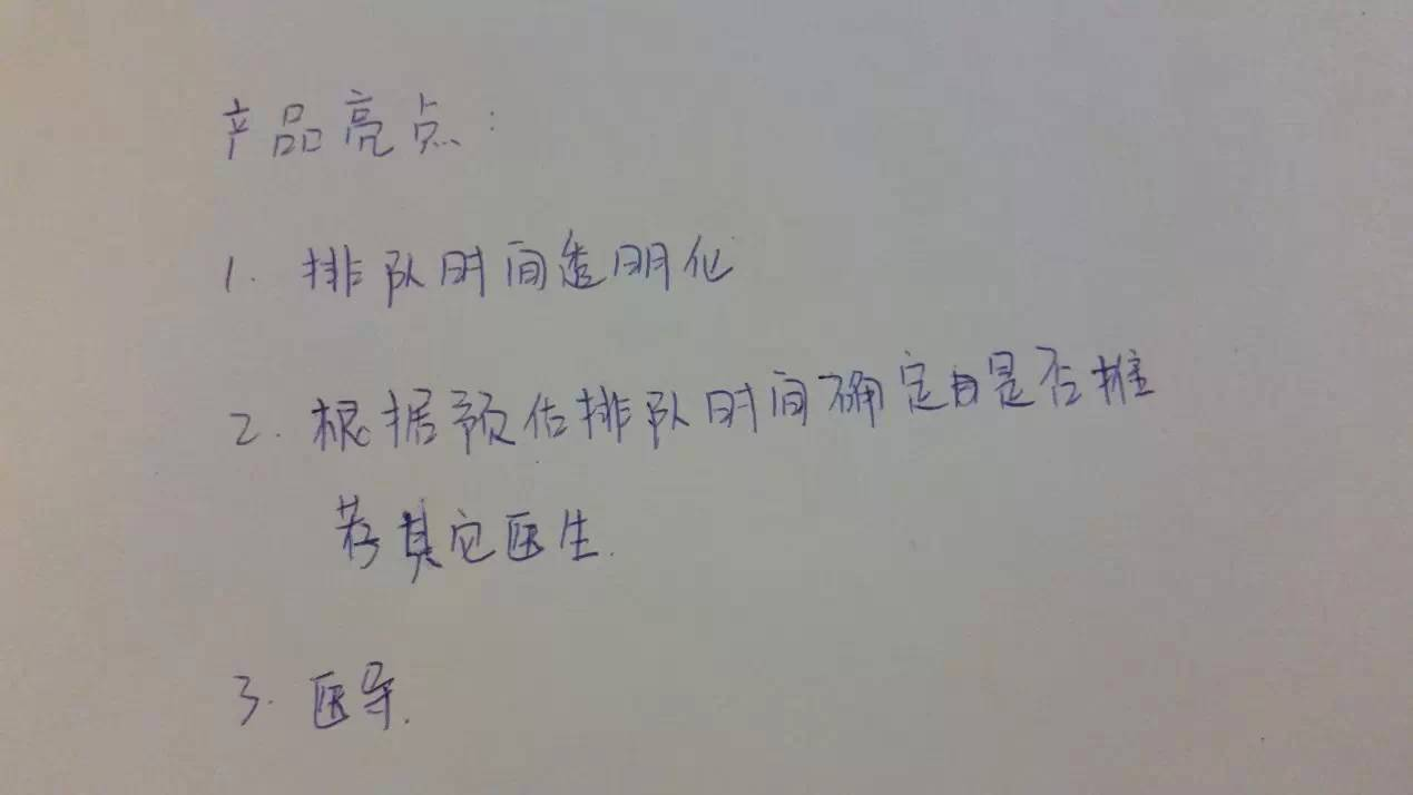 对于产品亮点的解说:1、排队时间透明化。这一点显而易见,不再赘述。2、根据预估排队时间确定是否推荐其他医生。若是用户所选择的医生预估排队时间过长,比如超过24个小时(具体时间需要按照病情来确定,比如急性病的预估排队极限时间要比慢性病短)就推荐同一家医院另一个挂号人数较少的医生,或者推荐附近医院的医生。3、医导。由于我们在核心功能上实现了LBS,所以增加医导这一功能,完善用户体验。医导即医院内部导航,比如我要去做心电图,打开应用就可以通过手机导航到相应的检查科室。这一功能也将极大节省用户就医时间,提高就医体验。