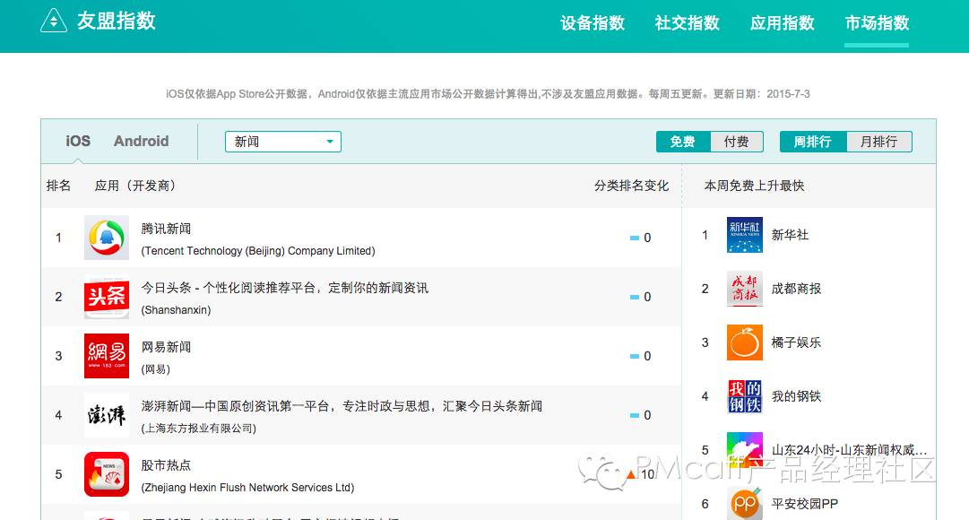 图1为友盟市场指数iOS 新闻类免费榜 7月3日数据