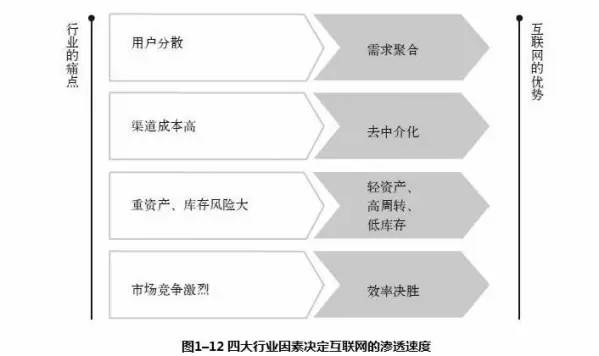 用户分散、渠道成本高、重资产且库存风险大,以及市场竞争激烈的行业将率先被互联网腐蚀。互联网的高效率优势对应改造传统行业的上述痛点:聚合分散的用户需求;强大的系统支持、创新的技术手段削减渠道冗余;轻资产产、高周转、低库存的供应链模式降低运营成本和经营风险;“专注、极致、口碑、快”的思维带来模式高效率,在市场化竞争中获得优势。