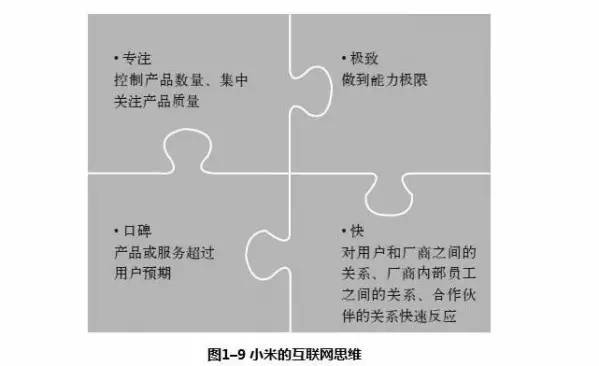 小米雷军的互联网思维可总结为“专注、极致、口碑、快”。“专注”即控制产品数量、集中关注产品质量,“极致”即将产品或服务做到能力极限,“口碑”即产品或服务超过用户预期,“快”即对用户和厂商之间的关系、厂商内部员工之间的关系、合作伙伴的关系都能快速做出反应。
