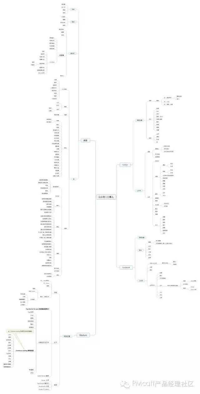 上图是我对我即将一起进行比较分析的几个平台Facebook、Twitter、Medium和微信进行比较的脑图,随意看看就好,不是重点。