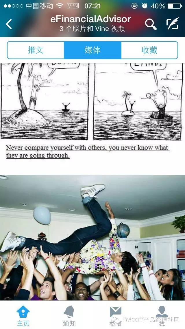 Tweet的设置主打的是四个功能栏:主页、通知、私信、我。