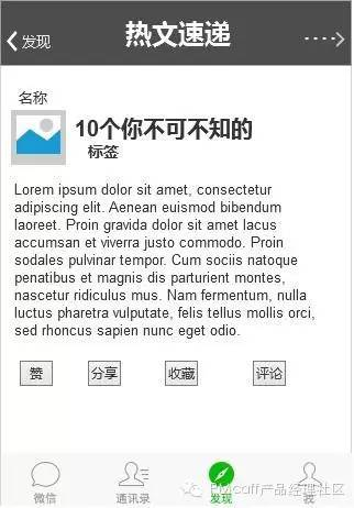 而在发现栏目中“热文推荐”,打开后文字的展示形式就和“朋友圈”的展示形式类似:名称、标题、图文、点赞、回复的形式即可。