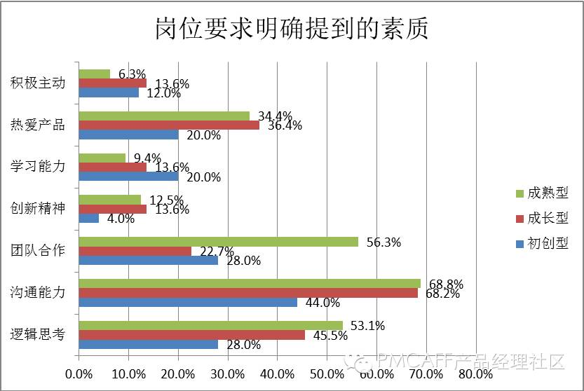 成熟型公司对于数据分析有要求的会较其它两者多一些,可能是因为成熟型公司的产品一般已经有不少用户,需要做的很多工作是对产品的优化,所以需要善于根据数据来发现更多适合优化的地方。另外成长型公司对于产品运营有要求的会比另外两个多一点,应该是由于成长型公司产品已有一定基础,但是用户量却没有上来,所以产品经理需要更多的从运营上思考,怎样做才可以和运营部门一起将用户量提升上来。