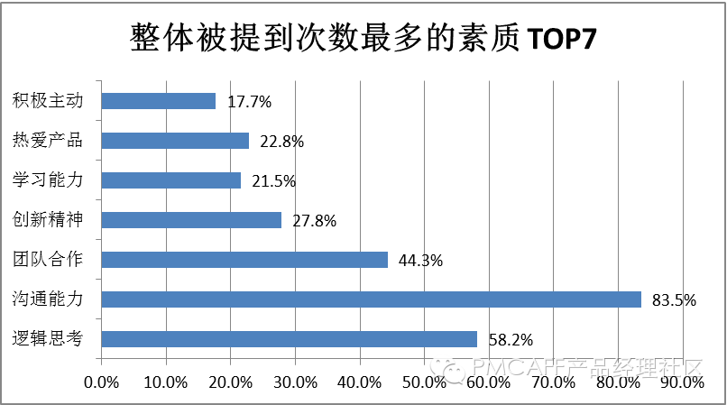任何岗位都有其素质要求,作为产品经理,最常被提到的素质以及提到它的岗位个数占总岗位数目的比例见下图。其中沟通能力最受关注,有83.5%的岗位提到,逻辑思考能力次之,有58.2%的岗位提到。