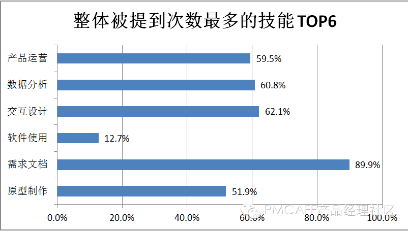 产品经理需要掌握的技能有很多,最常被提到的有产品运营、数据分析、交互设计(包括了解Android和iOS设计规范)、office等软件的使用、需求分析和文档撰写、原型制作,提到它们的岗位个数占总岗位数目的比例见下图。另外还有一些像技术、测试等有少量岗位有提到。