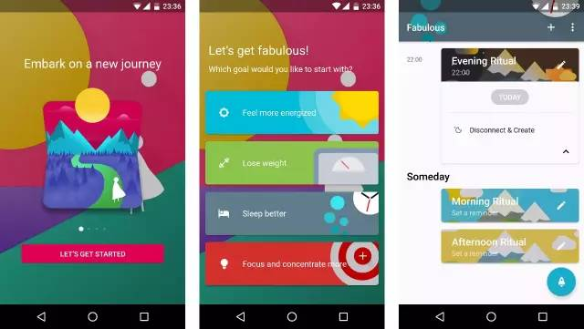 乍看之下,Fabulous 是一个五颜六色的混合体。它使用了广泛和大胆的颜色,其中包括 Material Design 色板上的每一种主色调 —— 除了受到 Material Design 的启发,Fabulous 还想借此告诉用户,这是一个丰富多彩的世界(fabulous world),值得用心探索。