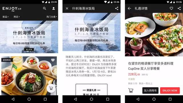 ENJOY 是一个提供「精选限量美食」的应用。在产品设计的理念里,它希望给用户带去精致感和品质感。