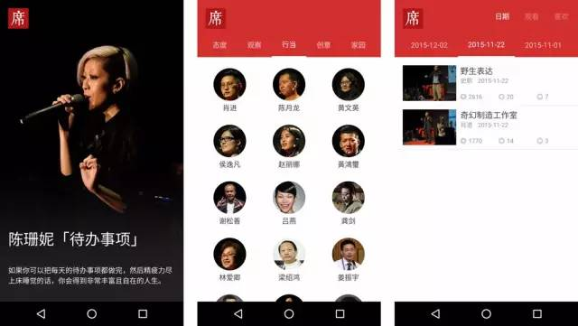 一席的主色调是红色,它来源于一席的现场。通过这种颜色,一席希望让用户感受到现场演讲的氛围,舞台上红色的地毯和投射出来的灯光。一席设计师梧桐说,一席想用演讲,让每个人都感受到在生活中的激情、乐趣和韵味。