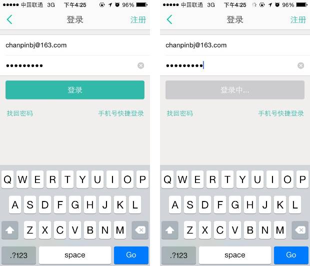 触发登录操作,除了登录按钮,也可以通过键盘上“确定”(或Done)等确定键来触发登录。键盘上的确定按钮触发登录,更具有连贯性。