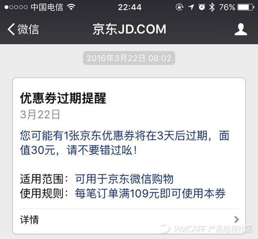 举个栗子:关注过京东服务号并绑定账号的朋友都知道,当新抵用券到账号,会有一条微信服务号消息推送。这就是在打通了账号体系后一大表现。