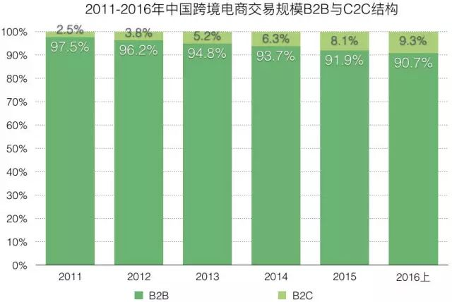 3、从国内市场上看,由于小批量、多批次、周期短的外贸订单的存在,使得B2C市场份额逐年上涨(9.3%,2016年上半年),平台方开始呈现出2B、2C等多元化发展。但B2B跨境电商订单量级大、且稳定,可以有效解决商业效率问题,在未来很长一段时间,B2B在整个跨境电商行业仍将占据主导地位(90.7%,2016年上半年)。