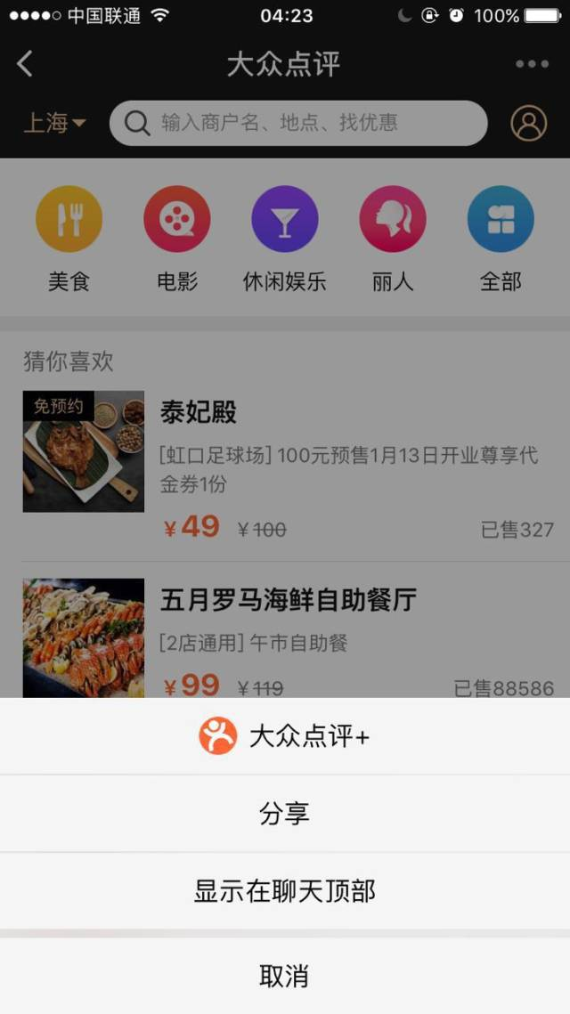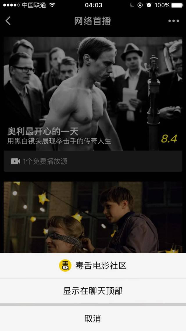 但目前并不是所有的小程序都提供了分享按钮(如第一张截图中的毒舌电影就只能置顶,没有分享),并且目前小程序只支持分享到微信聊天中。