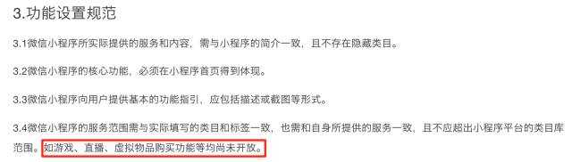 另外一方面,微信也在小程序发布之初指出了上面这个问题,「游戏、直播和虚拟物品等功能尚未开放」这一举措是为了避开与苹果的付费下载和内购两种模式的竞争。